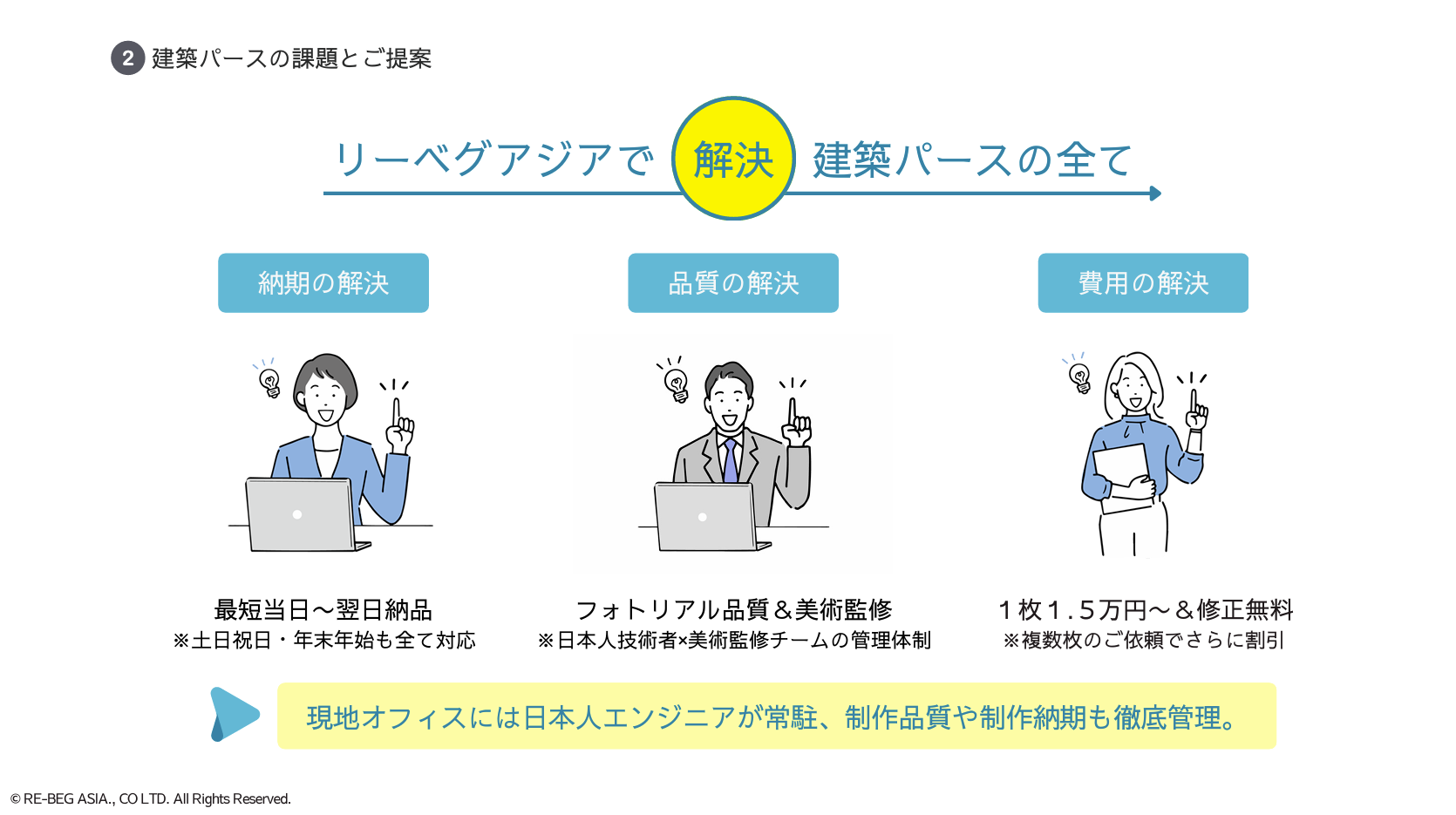 高精度のパースを低コストで安定的に作成できる仕組みを知ることで、「外注は高い」という従来の思い込みが覆ります。
