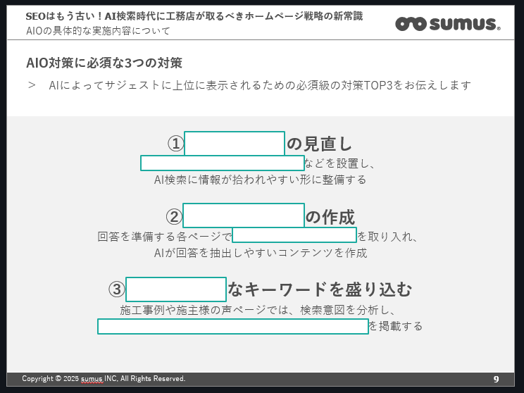 など、本パートではAIに抽出されやすいコンテンツ作りの具体的な方法や、制作会社に依頼するときに押さえるべきチェックポイントについて分かりやすく解説します。