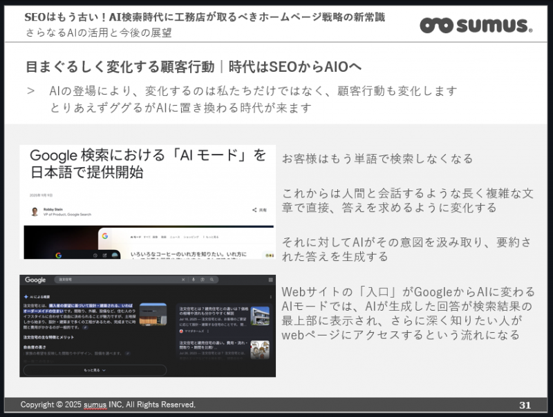 これまで、住宅会社のホームページと切っても切り離せなかった「SEO(検索エンジン最適化)対策」。ところが、いまやGoogle検索ではAIが先に答えを提示し、これまでのような検索順位が意味をなさなくなってきています。