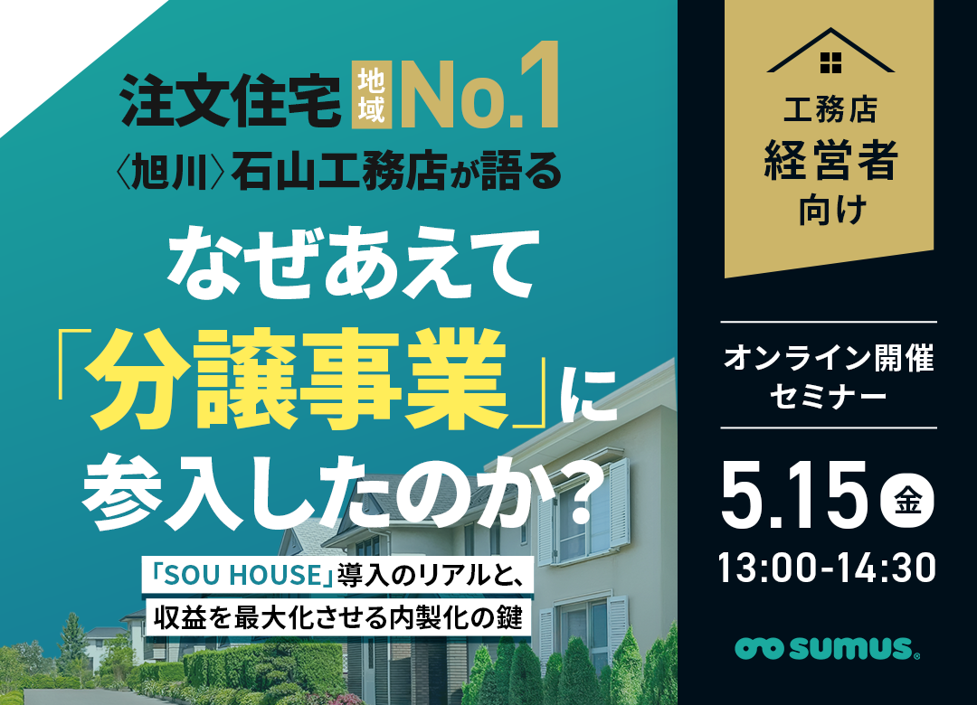 本セミナーでは、札幌で急成長を遂げた「SOU HOUSE」のビジネスモデルと、旭川No.1店である石山工務店様の参入秘話、そして分譲事業を最短で軌道に乗せるための戦略とノウハウを公開。工務店経営を安定させる「次世代の分譲戦略」を徹底解説いたします。